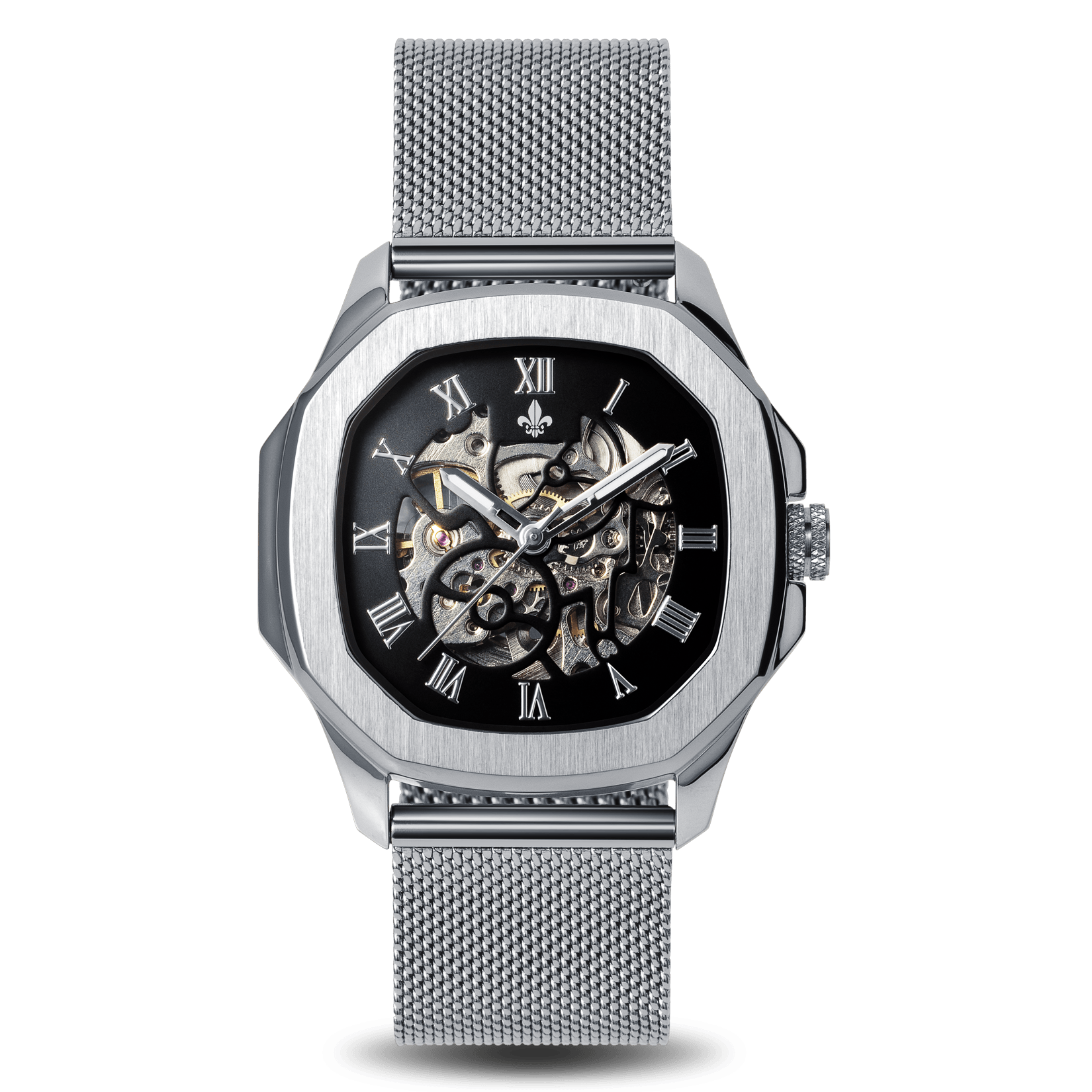 Peek into the heart of mechanics with the silver-and-black skeleton dial—a design that captures attention while exuding elegance. -