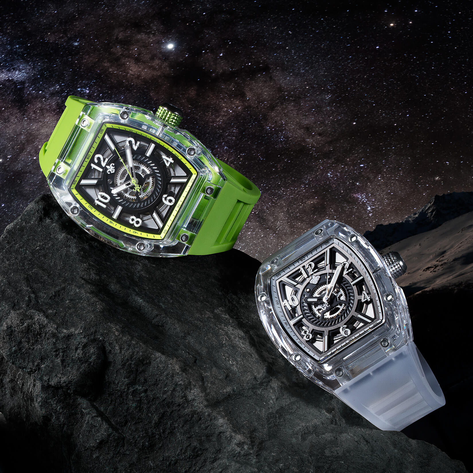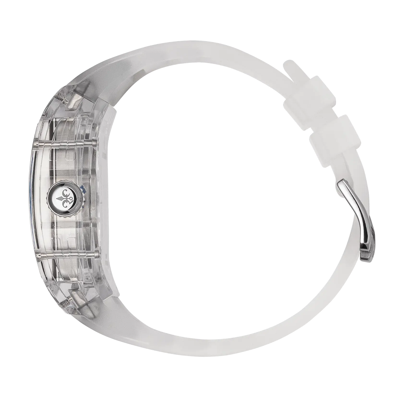 Experience elegance through clarity. This watch showcases a sleek, transparent polycarbonate case that’s not just striking—it’s ultralight and incredibly durable. Whether dressing up or keeping it casual, this timepiece beautifully blends artistry with precision.